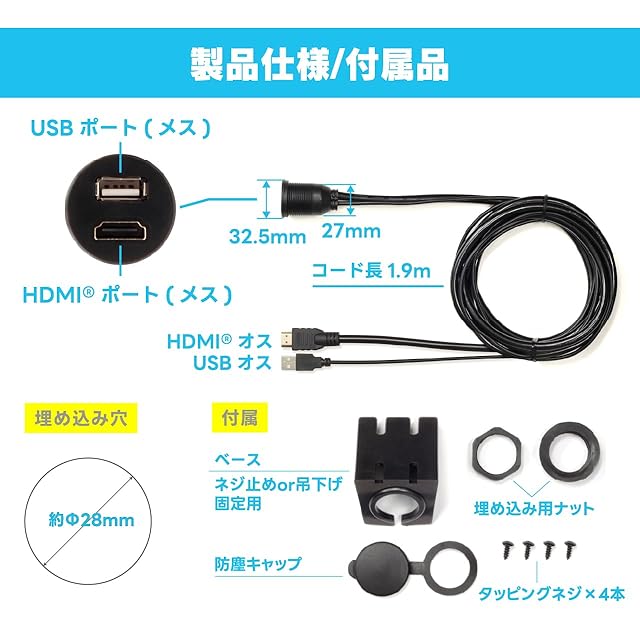 商品名:ビートソニック USB/HDMI延長ケーブル USB9 : 丸穴埋め込みタイプ 車用設置キット 1.9m ハイスピード HDMI 4K対応 USB2.0充電 データ転送