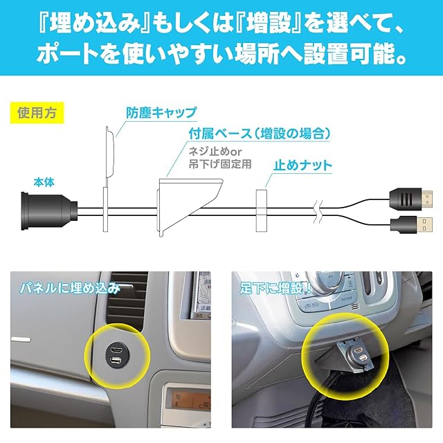 設置場所: 車のパネル、運転席足下など