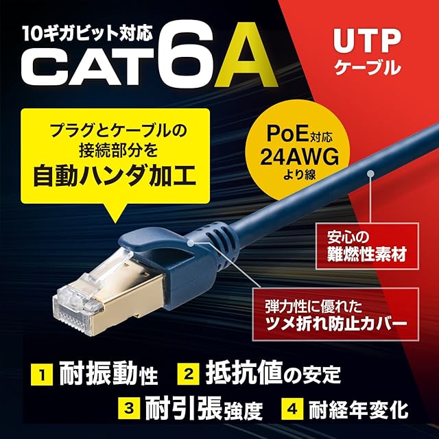 コネクタ内のハンダ加工により抵抗値の安定性を実現しています。耐振動性、耐引張強度、耐経年変化に優れた産業用途の高性能カテゴリ6A LANケーブルです。