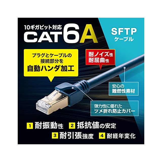 コネクタ内のハンダ加工により抵抗値の安定性を実現した、耐振動性、耐引張強度、耐経年変化に優れ、しかも耐ノイズ性にも優れた産業用途の高性能カテゴリ6A LANケーブルです。