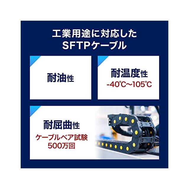 耐油性、耐温度性、耐屈曲性に優れた、工業用途に対応したSFTPケーブルを使用しています。