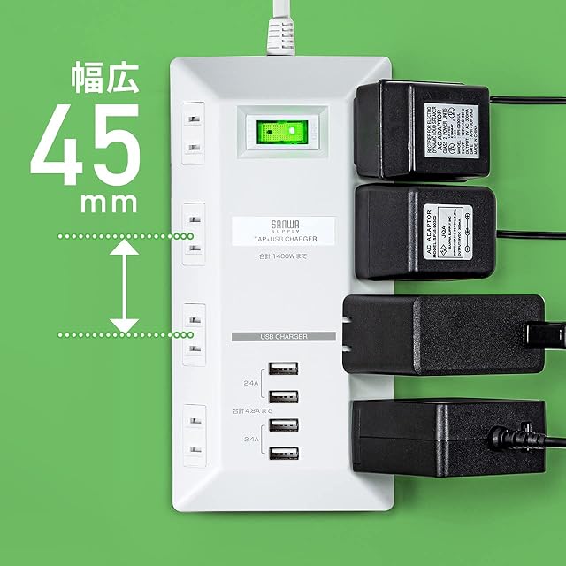 差込口が8個口あり、ACアダプタを差込む場合でも間隔を広く取っているので、心配ありません。