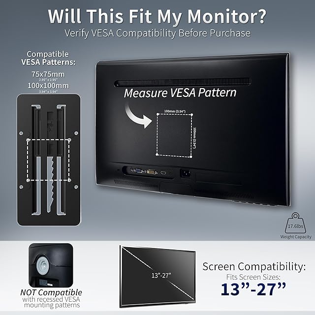 VESAの75×75mmまたは100×100mmの背面取り付け、最大17.6ポンドの重さの13インチから27インチモニターに対応。