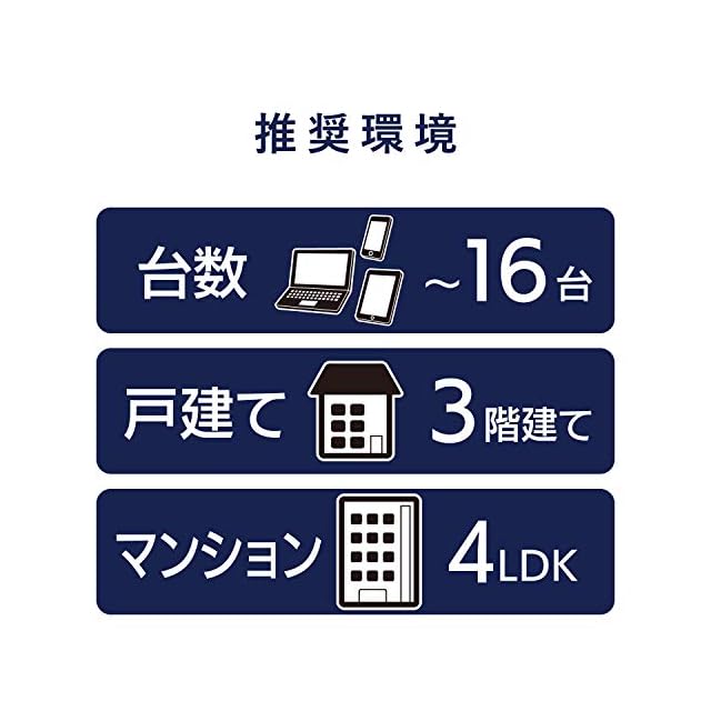 【推奨利用環境】戸建て3階建て、マンション4LDK、接続台数16台。実際の利用環境によって、電波状況は変化します。参考程度にご利用ください。