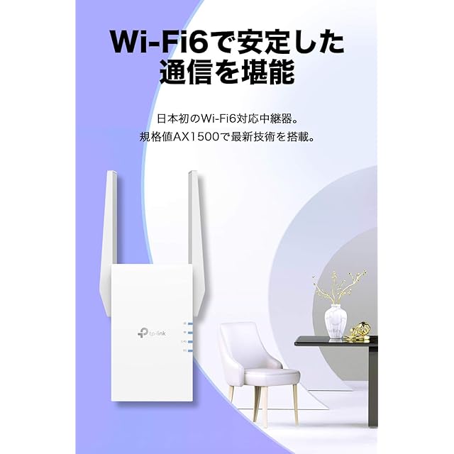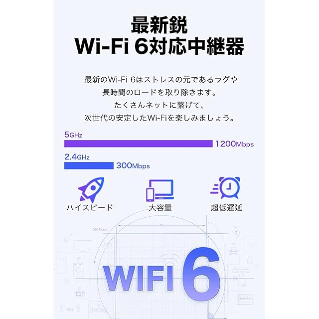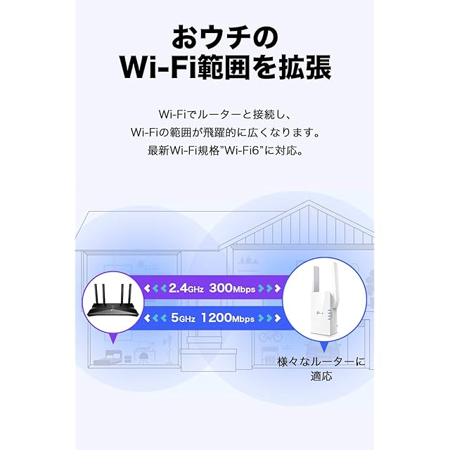 [特徴]: Wi-Fi6 規格値:1200Mbps + 300Mbps。Wi-Fiを中継し、繋がらなかった部屋にWi-Fiを届ける。