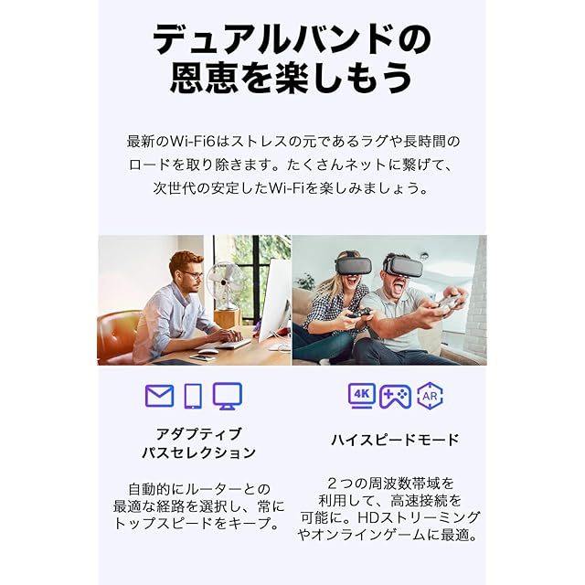 [WiFi6対応]:最新規格 "Wi-Fi6"。最新機能をフル搭載したWi-Fi6のスピードと安定性をより広い範囲で楽しもう。
