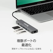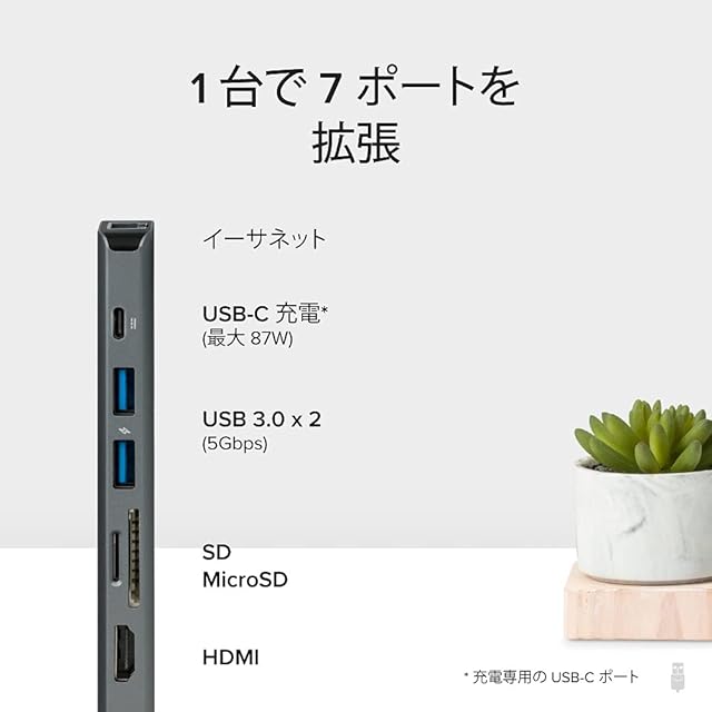 7 ポートによる拡張性 - 1 つの USB-C ポートまたは Thunderbolt 3 ポートを、7 ポートに拡張することができます。 この USB-C ハブには、USB 3.0 ポート x 2、ギガビット・イーサネットポート x 1、4K HDMI ポート x 1、SD カードリーダー x 1、microSD カードスロット x 1、USB-C PD(パワーデリバリー)対応充電ポート x 1 がついています。