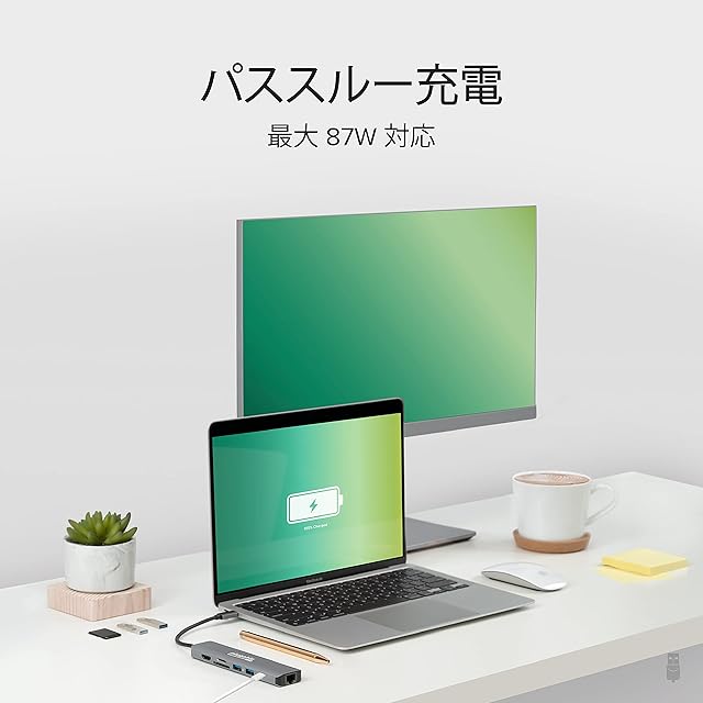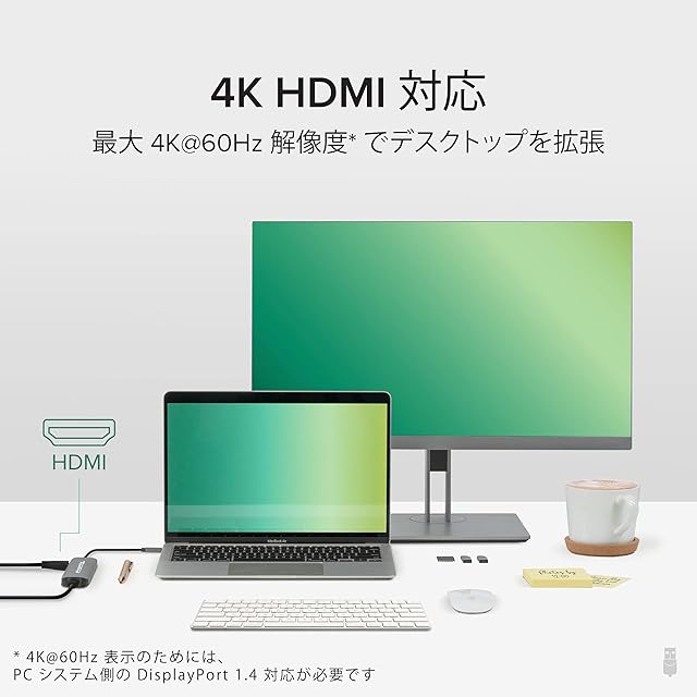 4K HDMI モニター対応 - 最大解像度 4K@60Hz 対応 HDMI ポートに、1 台の外部モニタを接続することができます。持ち運びにも便利なこのコンパクトなハブで、オフィスや家庭で簡単に外部モニタを接続でき拡張された画面領域で作業をすることができます。