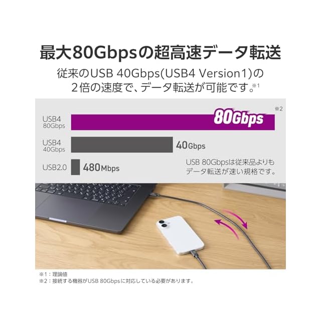 最大80Gbpsの超高速データ転送が可能。従来のUSB 40Gbps(USB4 Version1)の2倍の速度で、接続した機器間のデータ転送が可能です。 ※理論値