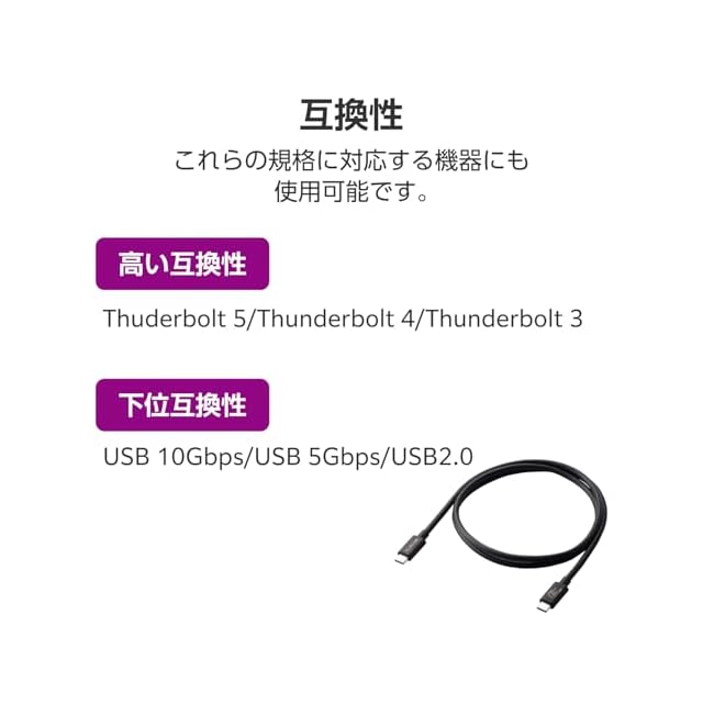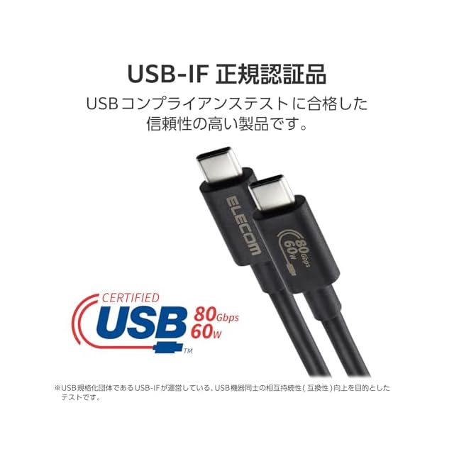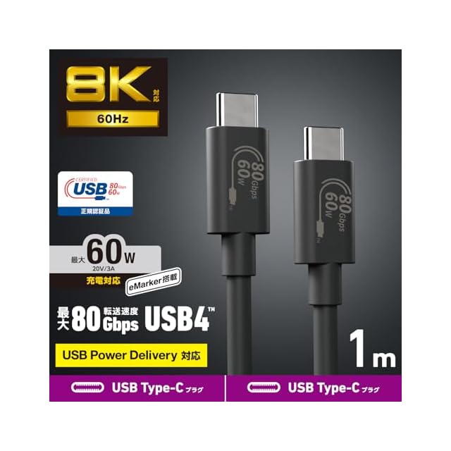 商品名:エレコム USB-C ケーブル 1m USB4 60W 高速データ転送 USB PD対応 最大80Gbps 8K/60Hz [Thuderbolt 5 / 4 / 3, USB3.x / 2.0 互換] 【USB-IF正規認証品】 USB4-V2CC10NBK