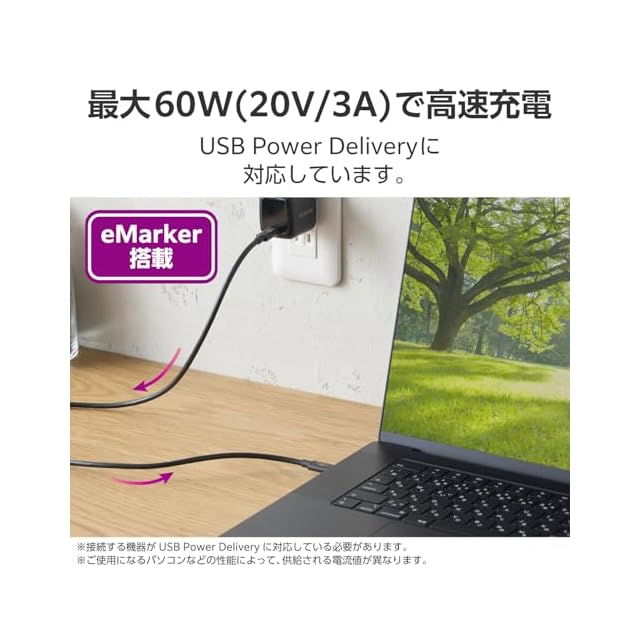 USB Power Delivery 最大60W(20V/3A)で充電できます。ノートパソコン、タブレットはもちろん、スマートフォンなどの高速充電も可能です。