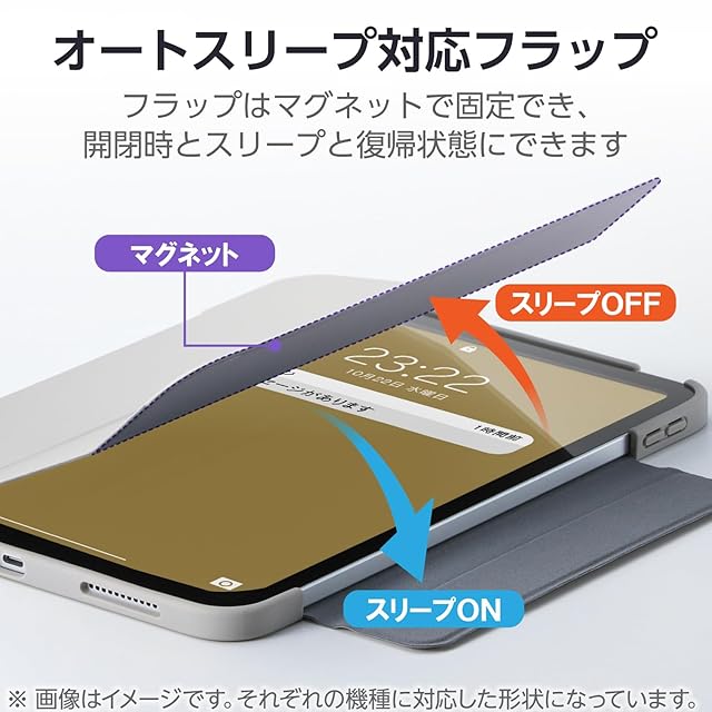持ち歩き時に画面を保護するフラップ付きです。フラップを閉じるとスリープモードになり、開けるとスリープから復帰します。