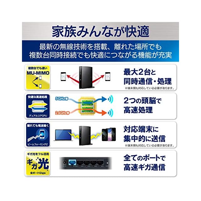 全てのLANポートが光インターネットに対応し、無線通信に関する最新技術を搭載した11ac対応無線LANルーター。