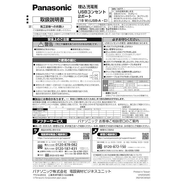 商品名:パナソニック(Panasonic) 埋込充電用USBコンセント2ポート 18W USB-A・C ホワイト WN1477SW
