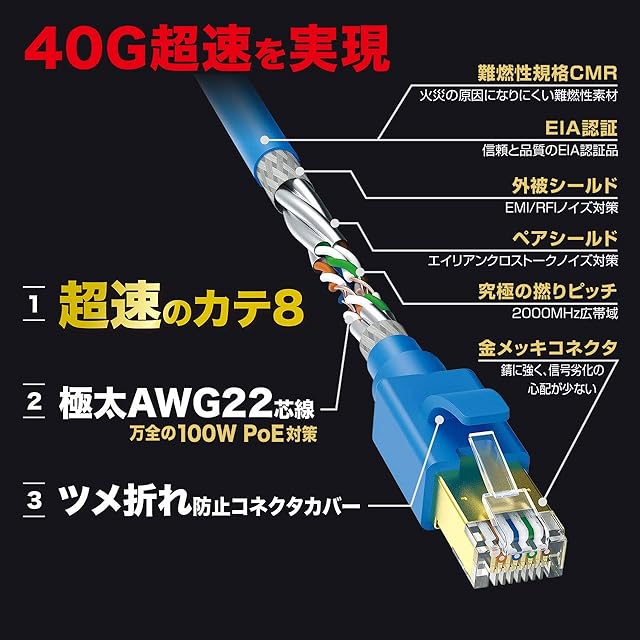 EIA認証ケーブル品質とプラグ内のより戻しを極限まで抑えることにより、次世代イーサネット40GBASE-T(40Gbps)に完全対応します。
