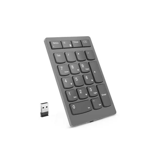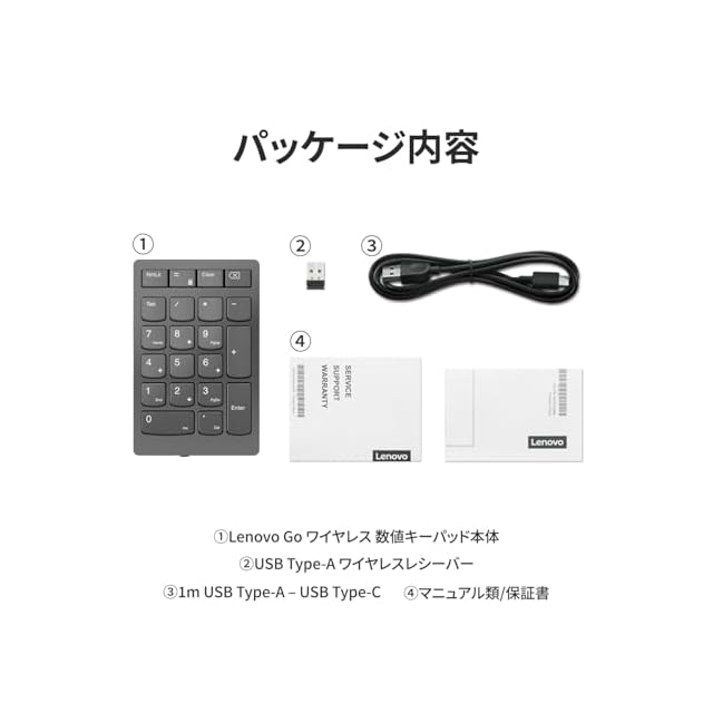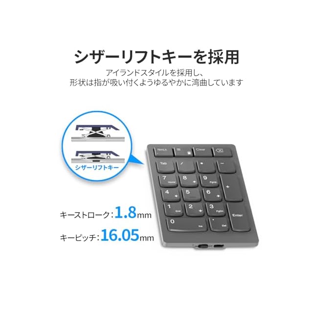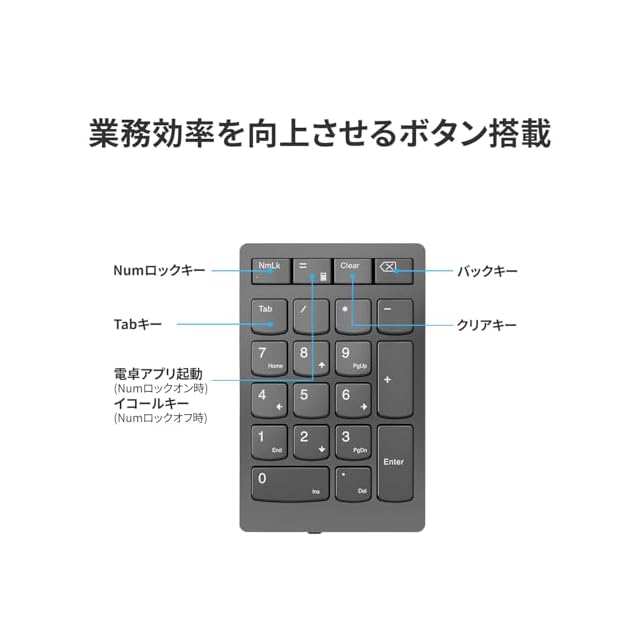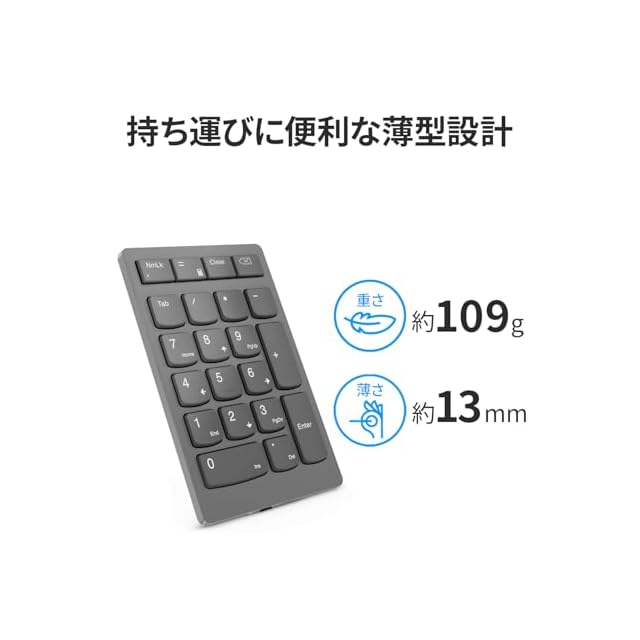 商品名:Lenovo Lenovo Go ワイヤレス 数値キーパッド 2.4G USB Type-A ワイヤレスレシーバー接続 テンキー シザーリフトキー Tabキー付き クリアキー付き 電卓アプリ起動ボタン 軽量 コンパクト グレー 4Y41C33791