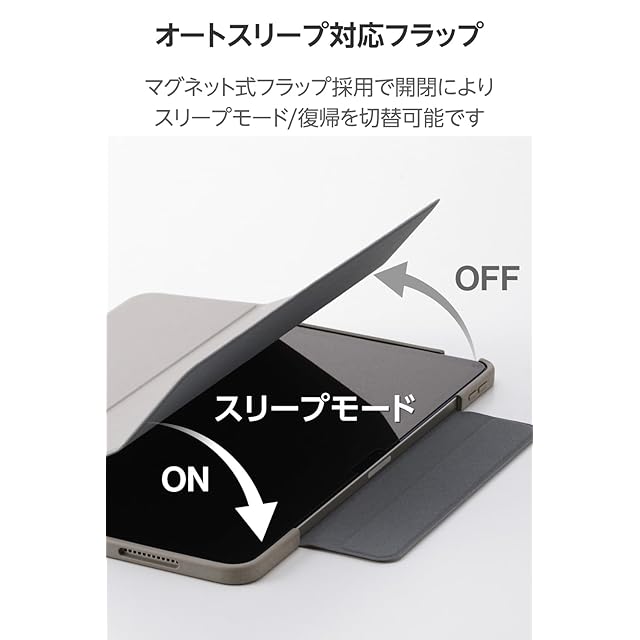 持ち歩き時に画面を保護するフラップ付きです。フラップを閉じるとスリープモードになり、開けるとスリープから復帰します。