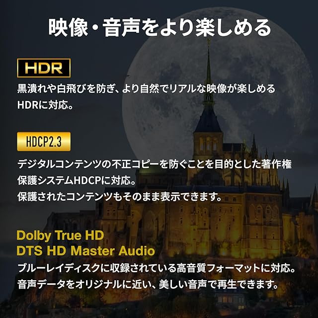 高輝度HDR(ハイダイナミックレンジ)、HDCP2.3に対応しています。