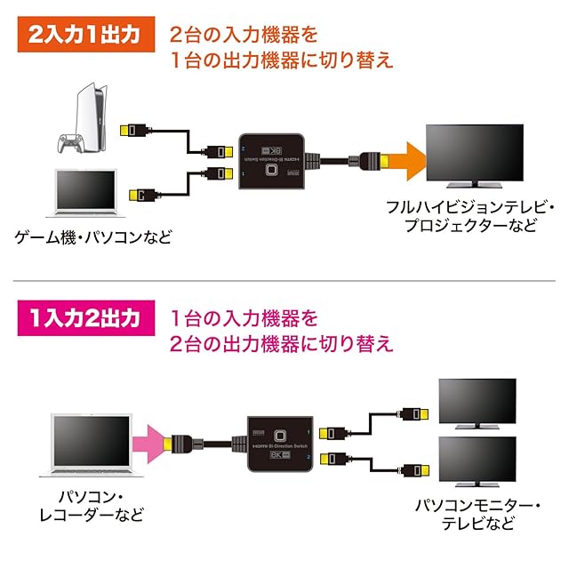 HDMI機器2台を切り替えて1台のテレビへ出力、またはHDMI機器1台を切り替えて2台のテレビやプロジェクター等に切り替えて出力できる双方向対応HDMI切替器です。※分配出力機能はありません。