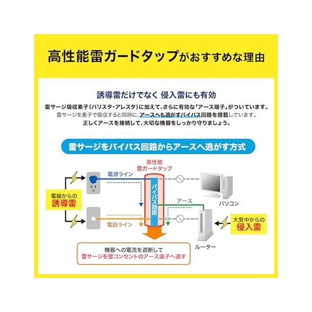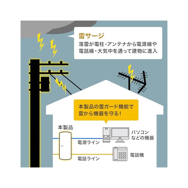 電源(AC)雷ガード/内蔵されたサージ吸収素子(バリスタ)が雷サージを吸収し、接続された機器を守ります。