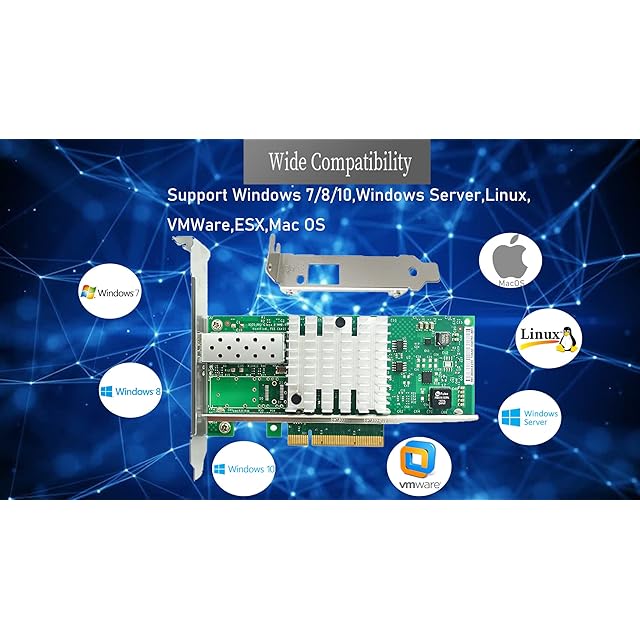 Windows Server 2003/2008/2012、Windows7/8/10*/Visa、Linux、ESX/ESXi*と互換性があります。イーサネット経由のストレージ:iSCSI、FCoE、NFS。(Windows 10ドライバーを正しく設定することで、NICをWindows 11で動作させることができます。インストールの詳細については、メイン画像をご覧ください。)