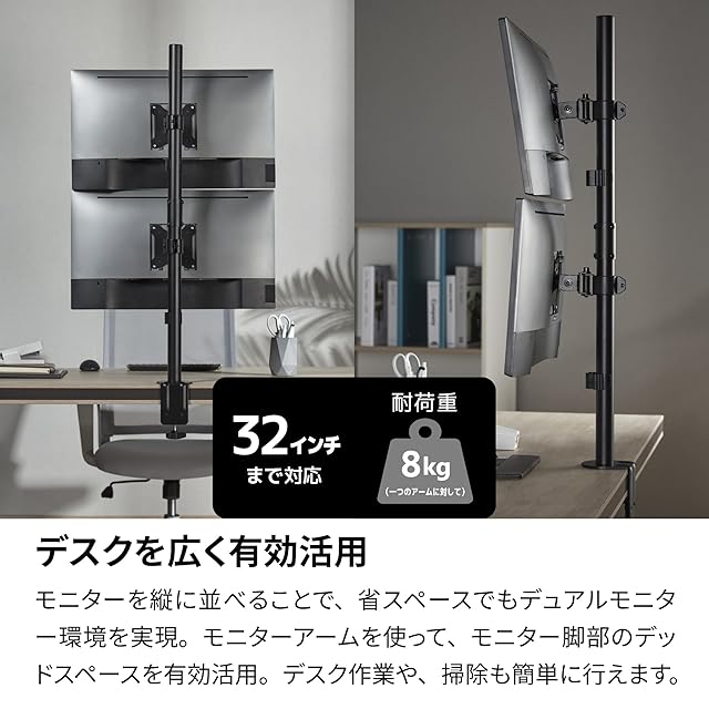 【デスクを広く有効活用】モニターを縦に並べることで、デスクスペースを広々と活用できます。モニターアームを使って、モニター脚部のデッドスペースを有効活用。デスク作業や、掃除も簡単に行えます。