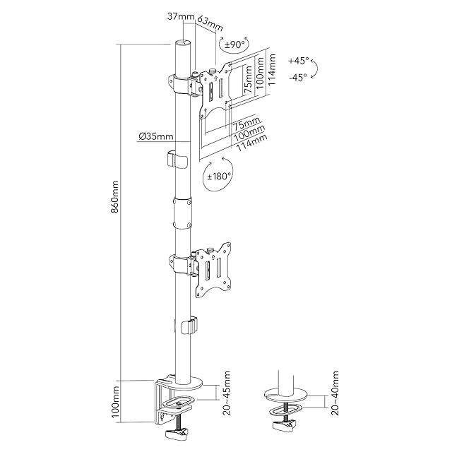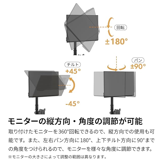【モニターの縦方向・角度の調節が可能】取り付けたモニターを360°回転できるので、縦方向での使用も可能です。また、左右パン方向に180°、上下チルト方向に90°までの角度をつけられるので、お好みの位置にモニターを調節できます。 ※モニターの大きさや重量によって調節の範囲は異なります。