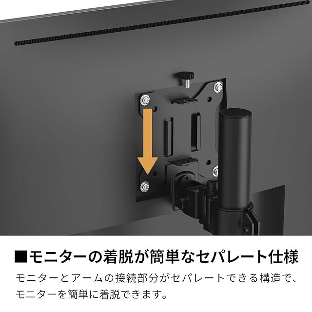 【モニターの着脱が簡単なセパレート仕様】モニターとアームの接続部分がセパレートできる構造なので、モニターの着脱が簡単です。
