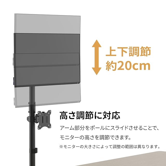 【高さ調節に対応】アーム部分をポールにスライドさせることで、モニターの高さを調整できます。 ※モニターのサイズや重量によって調節の範囲は異なります。