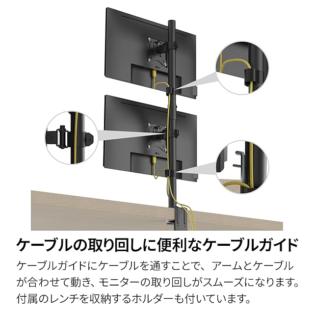 【ケーブルの取り回しに便利なケーブルガイド】ケーブルガイドにケーブルを通すことで、アームとケーブルが一緒に動くので、モニターの取り回しがスムーズになります。また、アームの位置や動作の調節を行うための工具を収納するためのホルダーも付属しています。