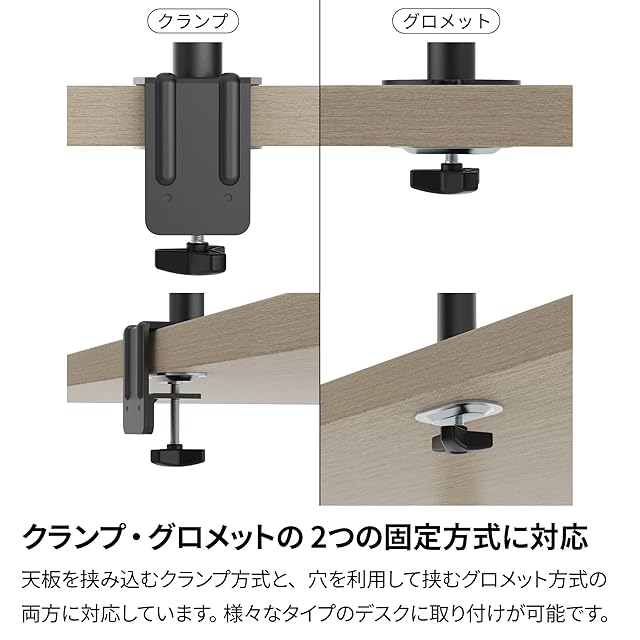【クランプ・グロメットの2つの固定方式に対応】天板を挟み込むクランプ方式と、穴を利用して挟むグロメット方式の、2つの固定方式に対応しています。様々なタイプのデスクに取り付けが可能です。