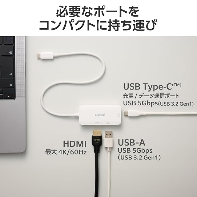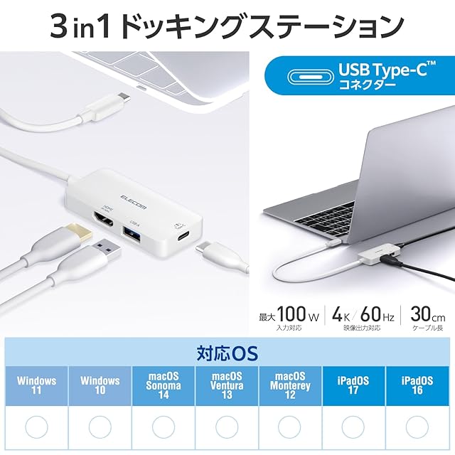 商品名:エレコム USB-C ハブ ドッキングステーション 3in1 PD対応 100W HDMI 4K60Hz 高速データ転送 5Gbps ホワイト DST-C31WH