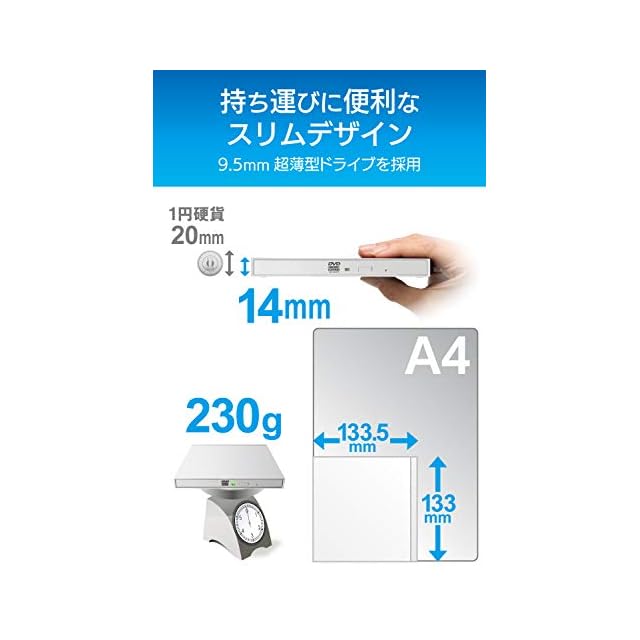 9.5mm超薄型ドライブを採用し厚さ14mm、質量わずか230g、ウルトラスリムPC、WindowsタブレットPCなどと一緒にご使用する環境にピッタリの製品