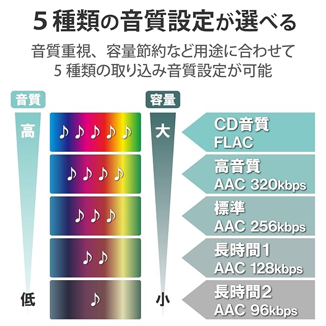 音楽を取り込む際は、音質を選ぶ事ができます。高音質のロスレスでのレコーディングから、スマホの容量を節約したい容量重視の設定が可能です。