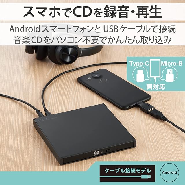 Androidのスマートフォン/タブレットとケーブル接続で、付属のアプリを使って、音楽CDの録音/再生ができるDVDドライブです。製品のカラーはブラック。