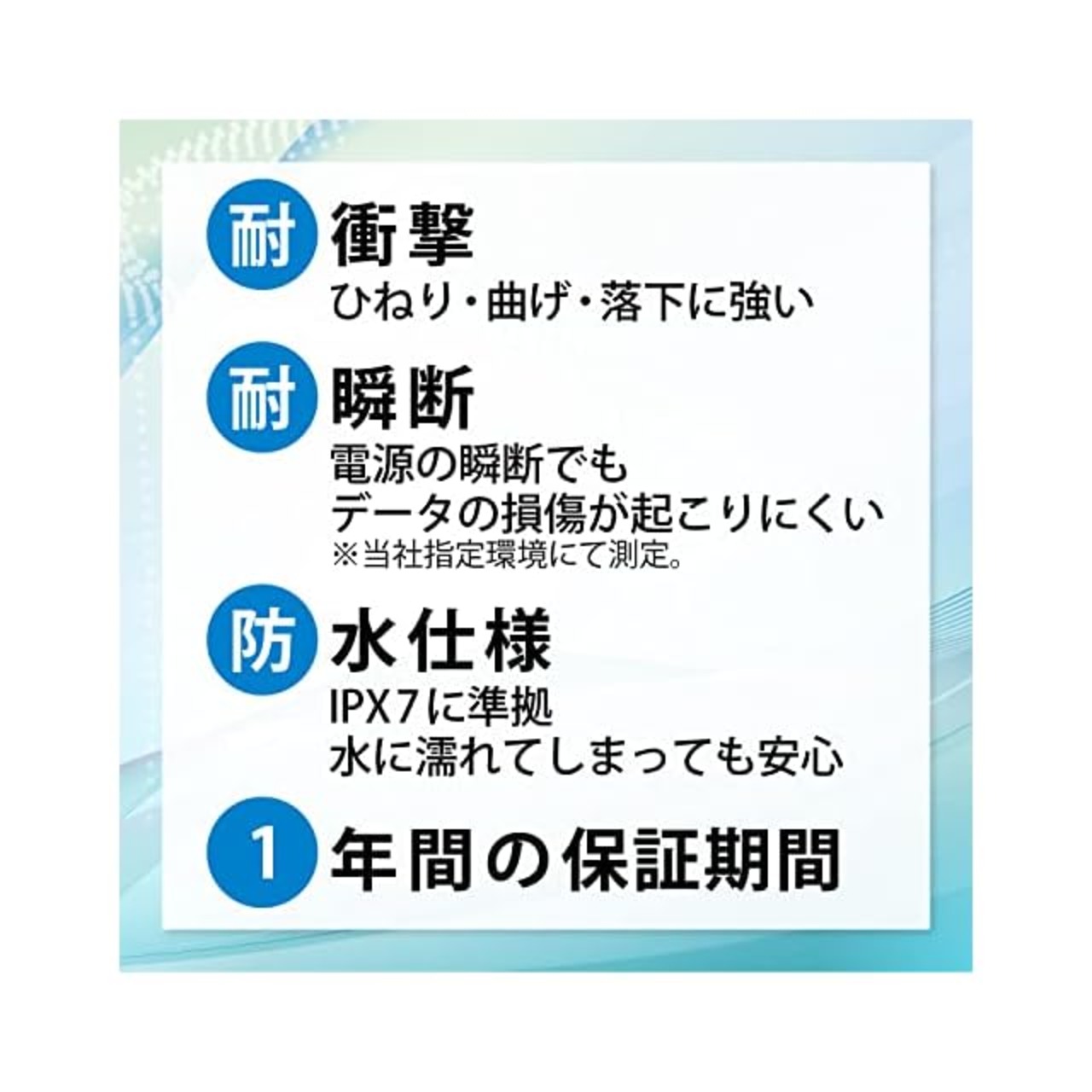 電源の瞬断でもデータの損傷が起こりにくい耐性を備えています。※当社指定環境にて測定。