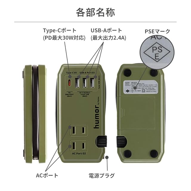 コンパクトなAC&USBタップ「humor handy」が、より便利にモデルチェンジ!<br><br>「humor(ユーモア) handy Plus」は、同時に複数の機器を充電できるコンパクトな充電タップ。<br>従来モデルから、より便利にモデルチェンジした商品です。<br>新機能追加により、旅行先やオフィス、在宅ワークでも大活躍!<br><br><br>【新機能】<br>・TYPE-C×1ポート→PD対応(MAX 30W)<br>・スマートフォンスタンド機能<br>・滑り止め機能<br><br>【他機能】<br>・ACコンセント×2ポート<br>・USB-A×3ポート<br>・PSE規格を取得(電気用品安全法)<br>・スマートIC搭載<br>・AC電源最大1400W<br><br>※コンセントや配線器具の定格を超える使い方をしないでください。<br>※海外での使用はできません。<br>※充電用USBケーブルは付属していません。<br>※本製品はモバイルバッテリーではありません。<br>※タコ足配線はしないでください。過熱により、感電・火災の原因となります。<br>※機器によっては同時に充電できない場合があります。<br>※本製品およびパッケージは改良のため予告なく仕様を変更する場合があります。<br>※記載されている製品名・会社名などは各社の商標または登録商標です。<br><br>商品仕様<br>本体:約縦6.4×横13.7×厚3.1cm<br>重量:本体約207g<br>主素材:PC、PVC<br>入力:AC100V/ 50/60Hz 15A<br>出力:AC Port TOTAL 100V 14A 1400W MAX、Type-C(5V=3A/9V=3A/15V=2A/20V=1.5A)、USB-A Port(5V=2.4A TOTAL 5V=3A MAX)<br>ポート数:USB3ポート+Type-C1ポート+AC2ポート<br>ケーブル長 :約25cm<br>付属品:取扱説明書<br>:有