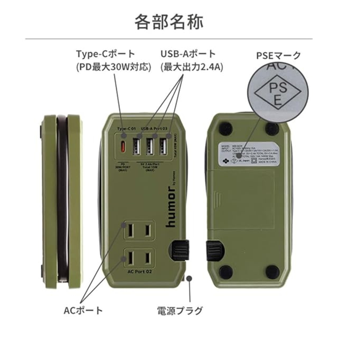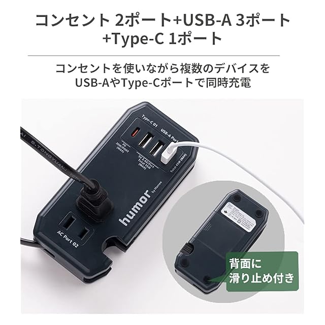 コンパクトなAC&USBタップ「humor handy」が、より便利にモデルチェンジ!<br><br>「humor(ユーモア) handy Plus」は、同時に複数の機器を充電できるコンパクトな充電タップ。<br>従来モデルから、より便利にモデルチェンジした商品です。<br>新機能追加により、旅行先やオフィス、在宅ワークでも大活躍!<br><br><br>【新機能】<br>・TYPE-C×1ポート→PD対応(MAX 30W)<br>・スマートフォンスタンド機能<br>・滑り止め機能<br><br>【他機能】<br>・ACコンセント×2ポート<br>・USB-A×3ポート<br>・PSE規格を取得(電気用品安全法)<br>・スマートIC搭載<br>・AC電源最大1400W<br><br>※コンセントや配線器具の定格を超える使い方をしないでください。<br>※海外での使用はできません。<br>※充電用USBケーブルは付属していません。<br>※本製品はモバイルバッテリーではありません。<br>※タコ足配線はしないでください。過熱により、感電・火災の原因となります。<br>※機器によっては同時に充電できない場合があります。<br>※本製品およびパッケージは改良のため予告なく仕様を変更する場合があります。<br>※記載されている製品名・会社名などは各社の商標または登録商標です。<br><br>商品仕様<br>本体:約縦6.4×横13.7×厚3.1cm<br>重量:本体約207g<br>主素材:PC、PVC<br>入力:AC100V/ 50/60Hz 15A<br>出力:AC Port TOTAL 100V 14A 1400W MAX、Type-C(5V=3A/9V=3A/15V=2A/20V=1.5A)、USB-A Port(5V=2.4A TOTAL 5V=3A MAX)<br>ポート数:USB3ポート+Type-C1ポート+AC2ポート<br>ケーブル長 :約25cm<br>付属品:取扱説明書<br>:有