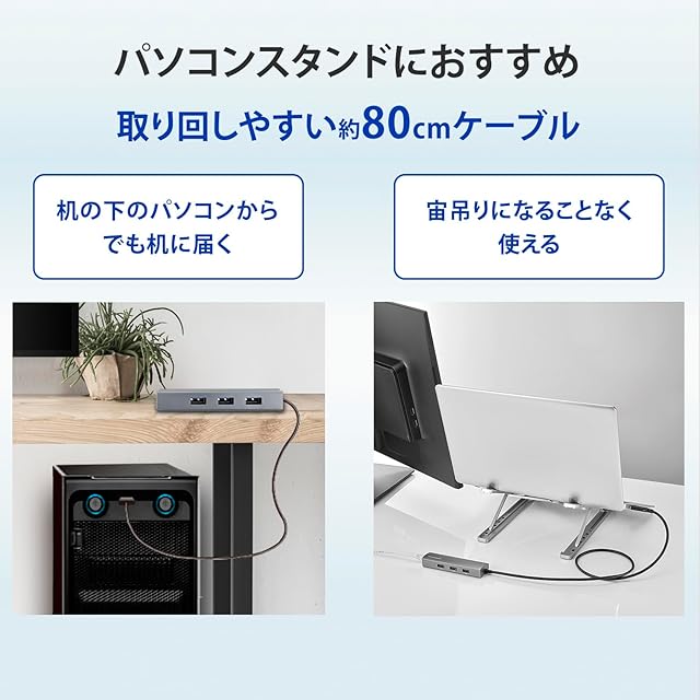 【パソコンスタンドに最適!取り回しやすい約80cmケーブル】長めに設計したケーブルによって、取り回しできる範囲が広がりました!スタンドに立てたノートPCに接続しても、机の下にあるデスクトップPCに接続しても、デスクの好きな場所に設置することが可能です。