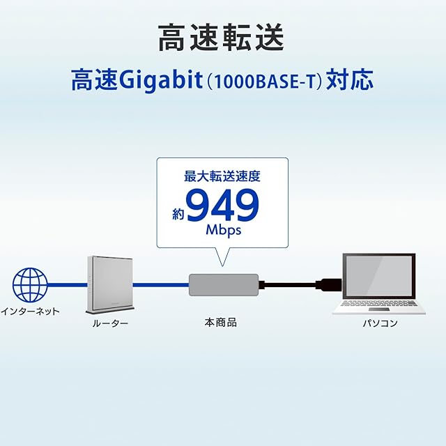 【最大転送速度約949Mbpsの高速転送!】ギガビット(1000BASE-T)に対応した本商品は、USB 3.2 Gen 1(USB 3.0)でパソコンと接続することで、最大転送速度約949Mbps(実測値)を実現しました。有線LAN接続にすることで無線LANよりも途切れにくく、安定した通信をご利用いただけます。