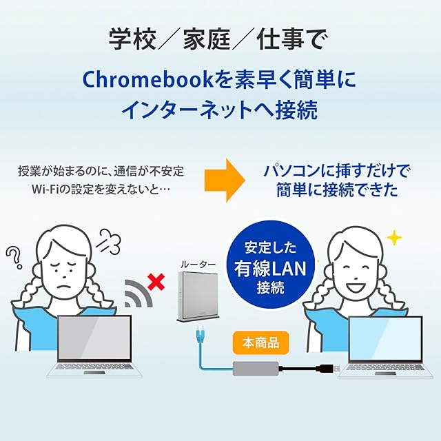 【学校/家庭/仕事で、Chromebookを素早く簡単にインターネットへ接続!】Wi-Fiが途切れて、お子さんがオンライン授業に参加できない、データをクラウドに保存できないといったことはありませんか?インターネットへの接続が肝心なChromebookだからこそ、Wi-Fi接続よりも安定した有線LAN接続がおすすめです。有線LAN接続をすることで、スムーズに学校の授業や仕事のミーティングに参加できたり、クラウドにアクセスすることができます。