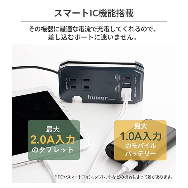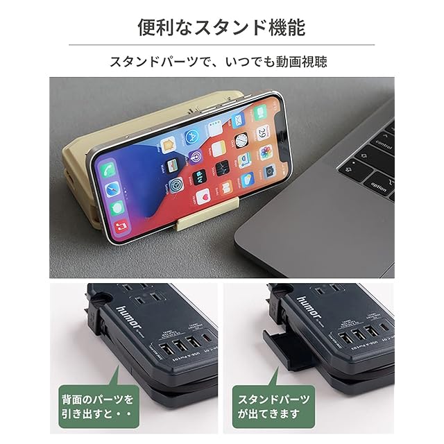 コンパクトなAC&USBタップ「humor handy」が、より便利にモデルチェンジ!<br><br>「humor(ユーモア) handy Plus」は、同時に複数の機器を充電できるコンパクトな充電タップ。<br>従来モデルから、より便利にモデルチェンジした商品です。<br>新機能追加により、旅行先やオフィス、在宅ワークでも大活躍!<br><br><br>【新機能】<br>・TYPE-C×1ポート→PD対応(MAX 30W)<br>・スマートフォンスタンド機能<br>・滑り止め機能<br><br>【他機能】<br>・ACコンセント×2ポート<br>・USB-A×3ポート<br>・PSE規格を取得(電気用品安全法)<br>・スマートIC搭載<br>・AC電源最大1400W<br><br>※コンセントや配線器具の定格を超える使い方をしないでください。<br>※海外での使用はできません。<br>※充電用USBケーブルは付属していません。<br>※本製品はモバイルバッテリーではありません。<br>※タコ足配線はしないでください。過熱により、感電・火災の原因となります。<br>※機器によっては同時に充電できない場合があります。<br>※本製品およびパッケージは改良のため予告なく仕様を変更する場合があります。<br>※記載されている製品名・会社名などは各社の商標または登録商標です。<br><br>商品仕様<br>本体:約縦6.4×横13.7×厚3.1cm<br>重量:本体約207g<br>主素材:PC、PVC<br>入力:AC100V/ 50/60Hz 15A<br>出力:AC Port TOTAL 100V 14A 1400W MAX、Type-C(5V=3A/9V=3A/15V=2A/20V=1.5A)、USB-A Port(5V=2.4A TOTAL 5V=3A MAX)<br>ポート数:USB3ポート+Type-C1ポート+AC2ポート<br>ケーブル長 :約25cm<br>付属品:取扱説明書<br>:有