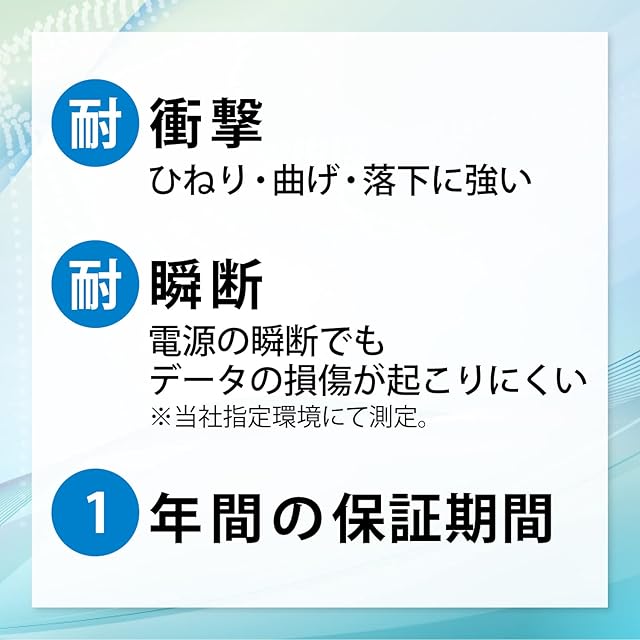 電源の瞬断でもデータの損傷が起こりにくい耐性を備えています。※当社指定環境にて測定。