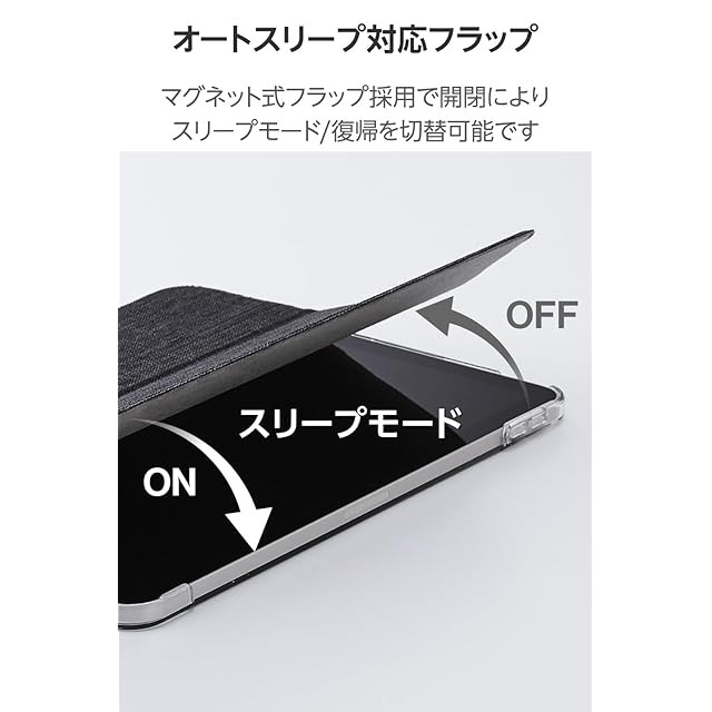 持ち歩き時に画面を保護するフラップ付きです。フラップを閉じるとスリープモードになり、開けるとスリープから復帰します。