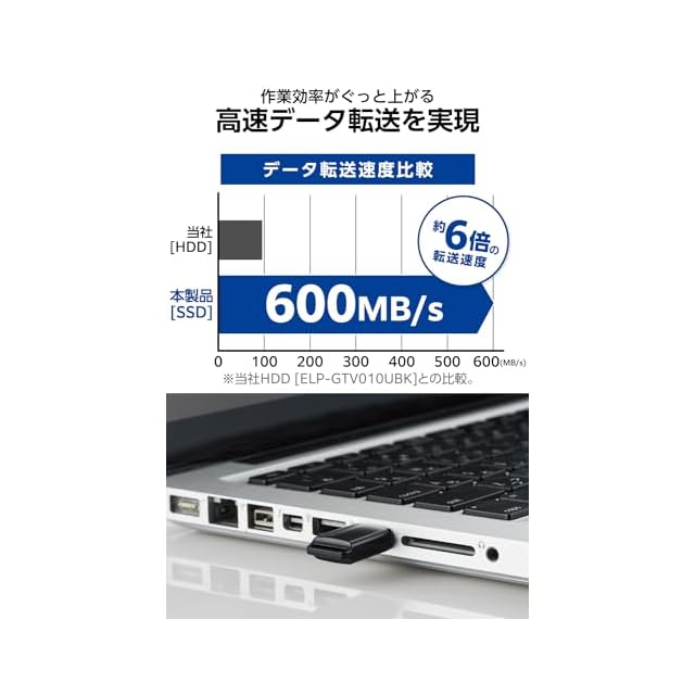 読み込み最大600MB/s、書き込み最大500MB/sの高速データ転送を実現しています。