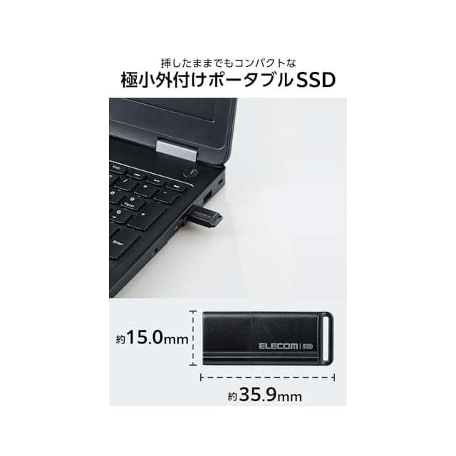 重さ約6g、幅約35.9mm×奥行約15.0mm×高さ約7.3mmで従来のスティックタイプの当社製外付けSSDよりコンパクトで、持ち運び、収納に便利なことに加えて、パソコン、テレビやゲーム機などに挿したままでも邪魔にならない極小USBメモリサイズです。