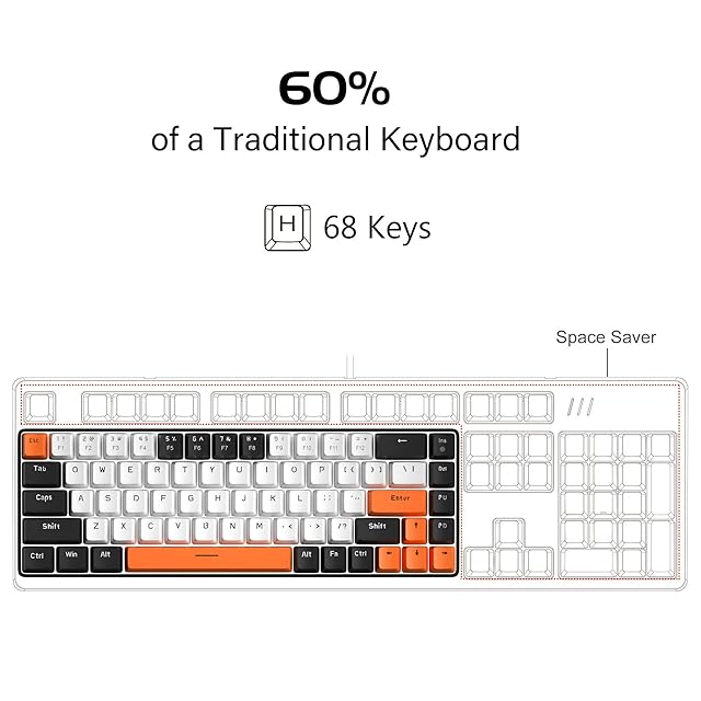 フルアンチゴーストキーボード:68個のキーすべてが競合しません。ホワイトブラックオレンジマッシュアップデザイン、人間工学に基づいたサスペンションダブルカラーインジェクションキーキャップ、ダブルキックスタンドフィートでタイピング角度を調整、取り外し可能なUSBケーブル、実用的で美しい。