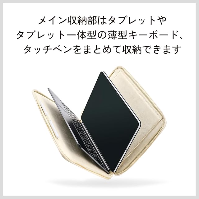 メイン収納部には、タブレットやタブレット一体型の薄型キーボード、タッチペンをまとめて収納できます。