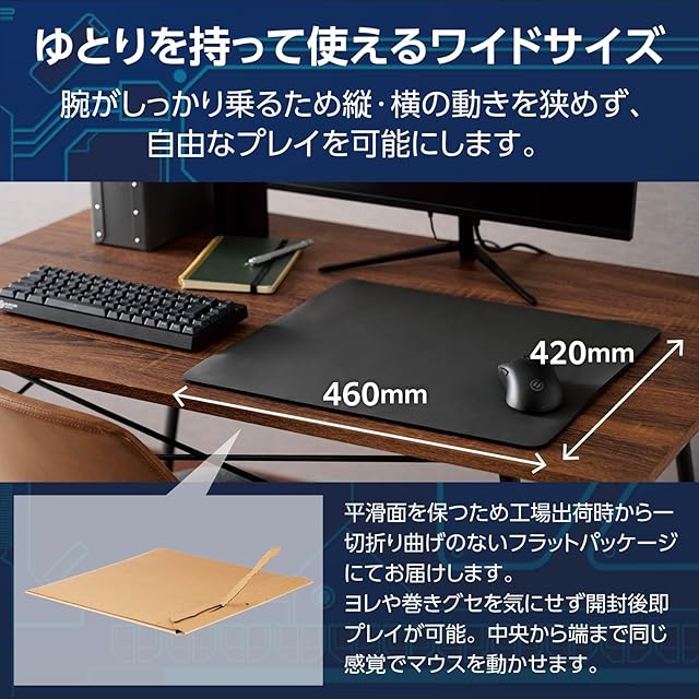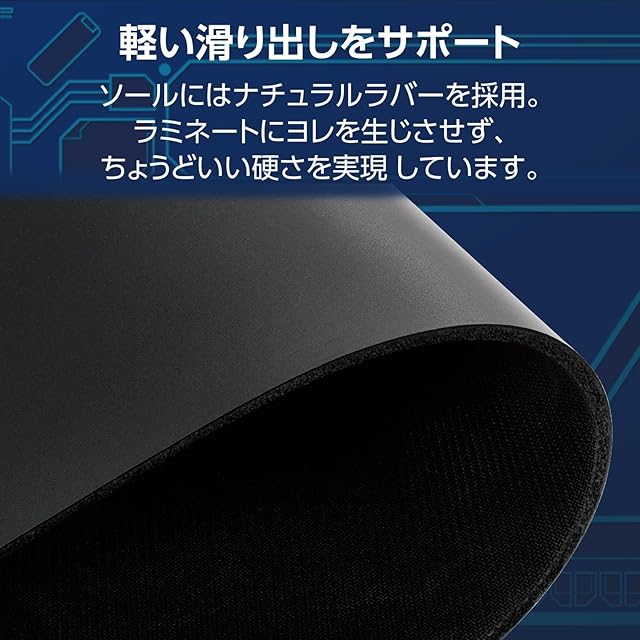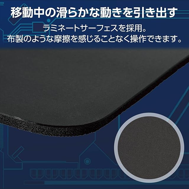 抵抗感のない軽い滑り出し、移動中のなめらかな動きを引き出すラミネートサーフェスを採用しています。布製のような摩擦を感じることなく操作できます。