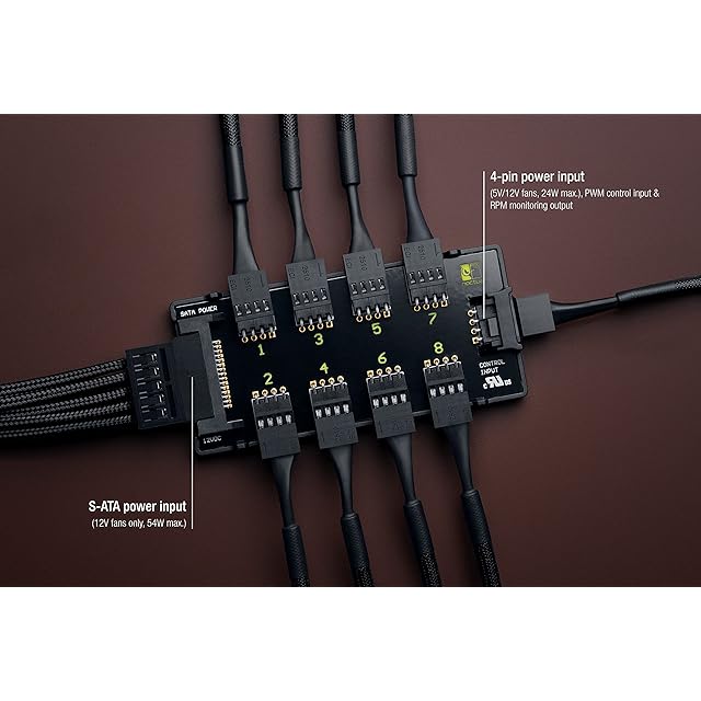 S-ATA(12Vファンのみ)による最大電力は54W、4ピンインターフェイスによる最大電力は24W。12V PCケースファンと、USB電源アダプタケーブルを含むNoctua製 5Vファン使用する5V環境の両方をサポートします。